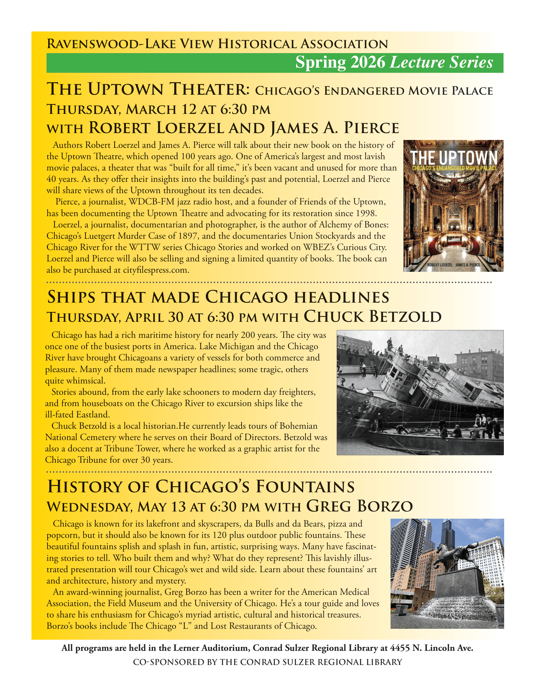 Spring 2026 Programs Posted by Ravenswood Historical Society Webmaster on February 12, 2026 Posted in: Current Programs, Posts. Leave a Comment Related posts: About Us New Website Spring Programs 2019 Fall Programs 2019 Posts navigation ← Fall 2025 Programs